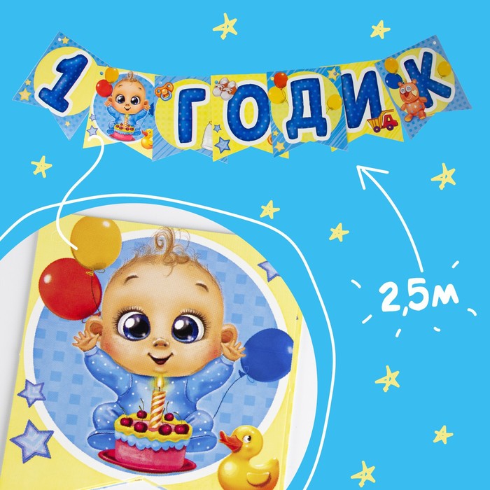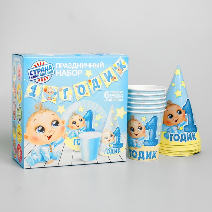 Посуда одноразовая бумажная для праздника «С днём рождения. 1 годик», набор, 6 тарелок, 6 стаканов, 6 колпаков, гирлянда
