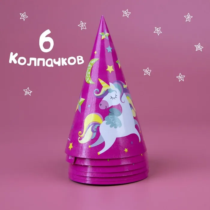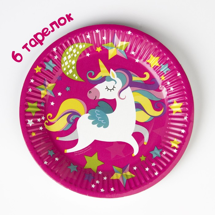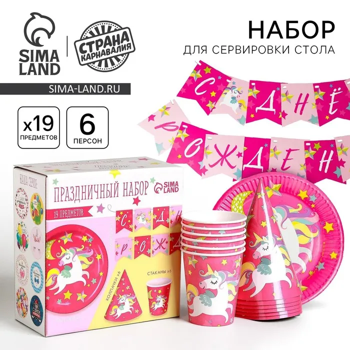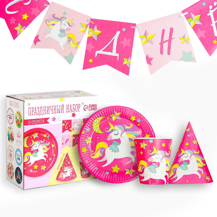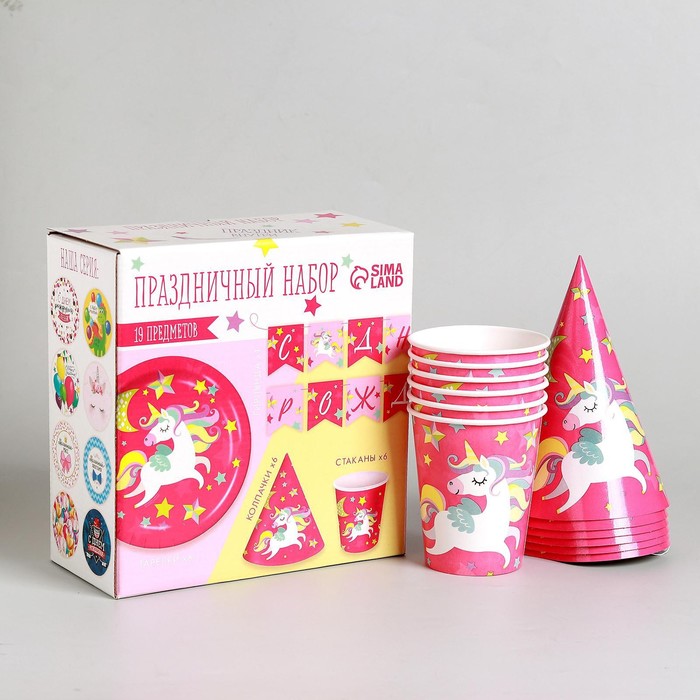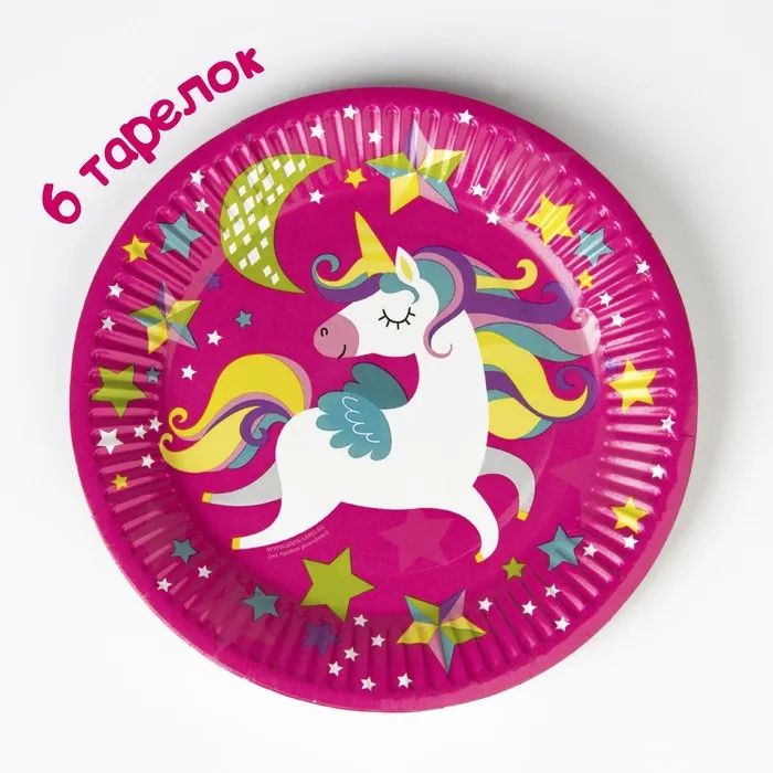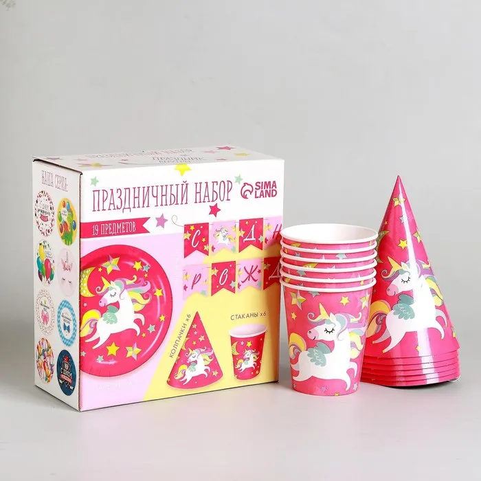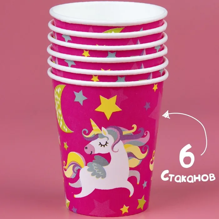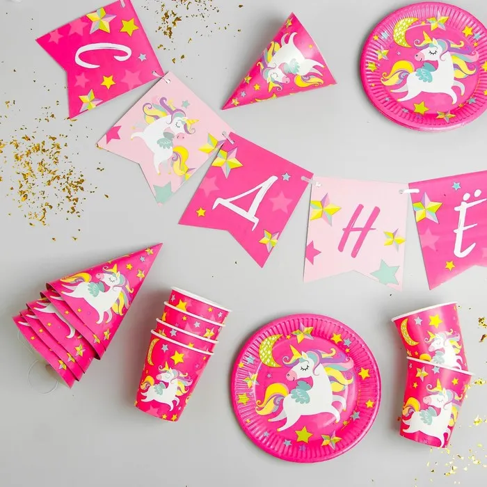 Посуда одноразовая бумажная для праздника «С днём рождения. Единорожек», набор, 6 тарелок, 6 стаканов, 6 колпаков, гирлянда — Характеристики