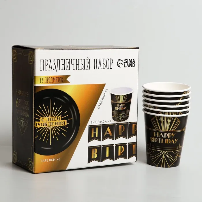 Посуда одноразовая бумажная Happy party, 6 тарелок, 6 стаканов, 1 гирлянда