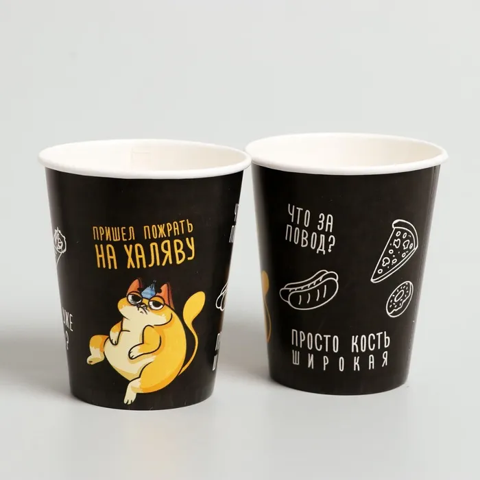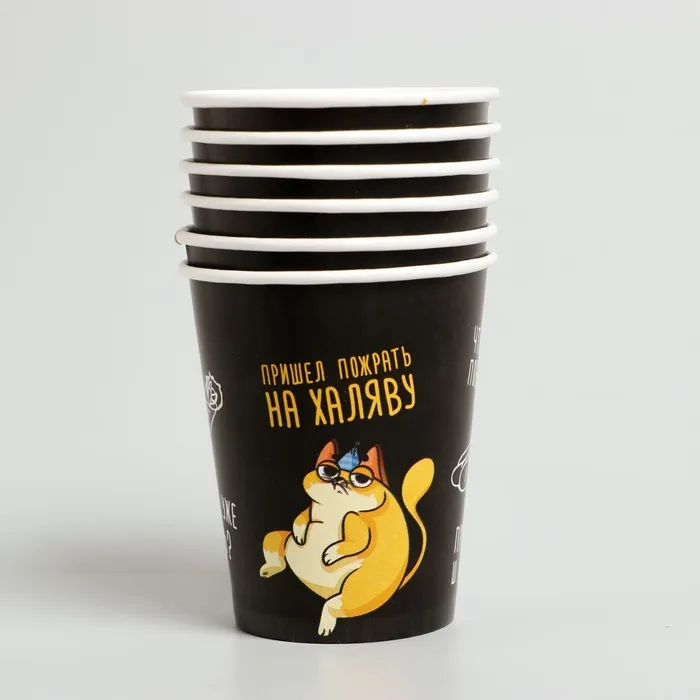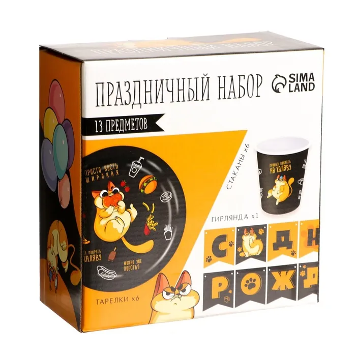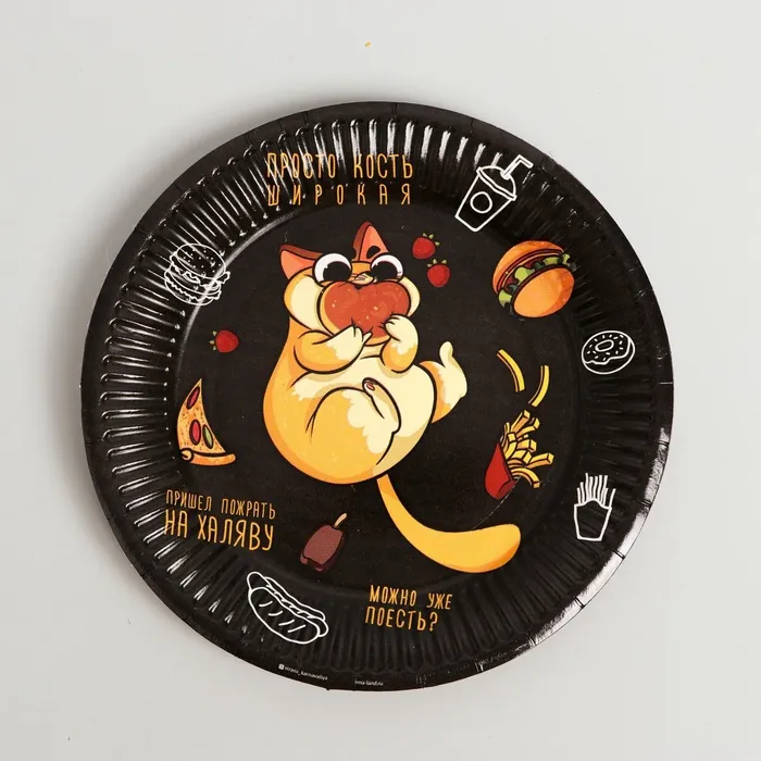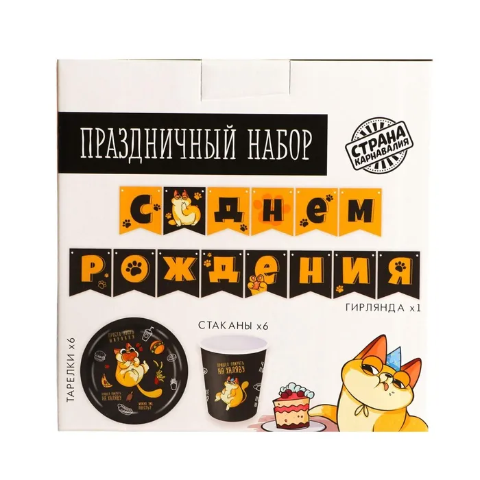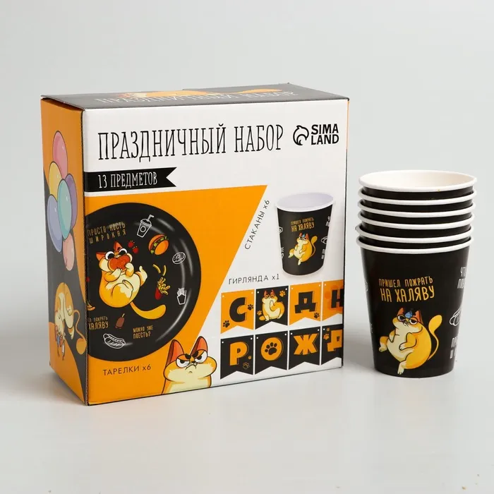 Посуда одноразовая бумажная «Котик обжора», 6 тарелок, 6 стаканов, 1 гирлянда — Характеристики