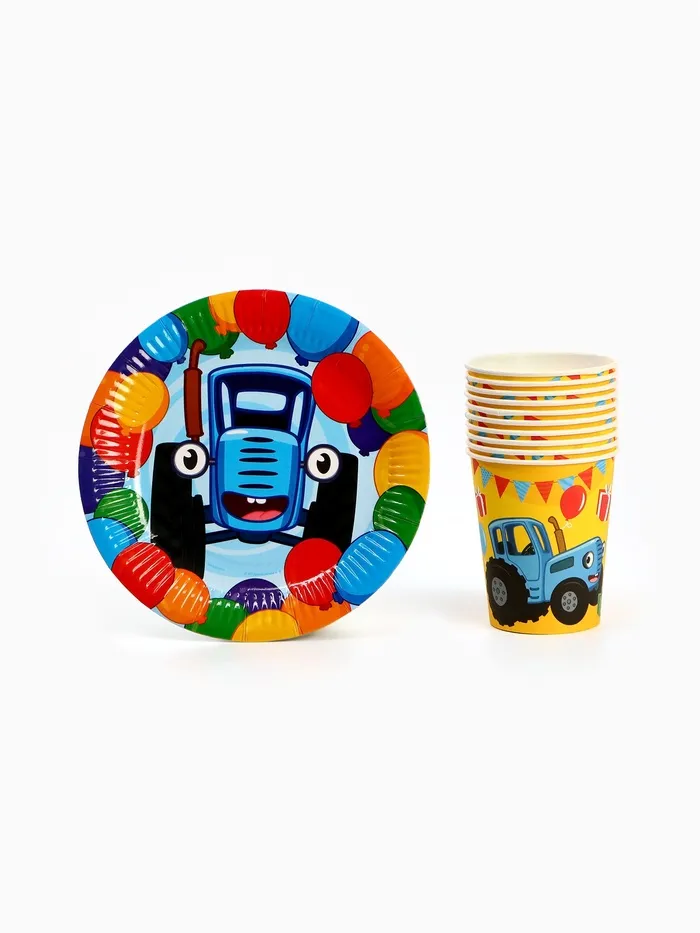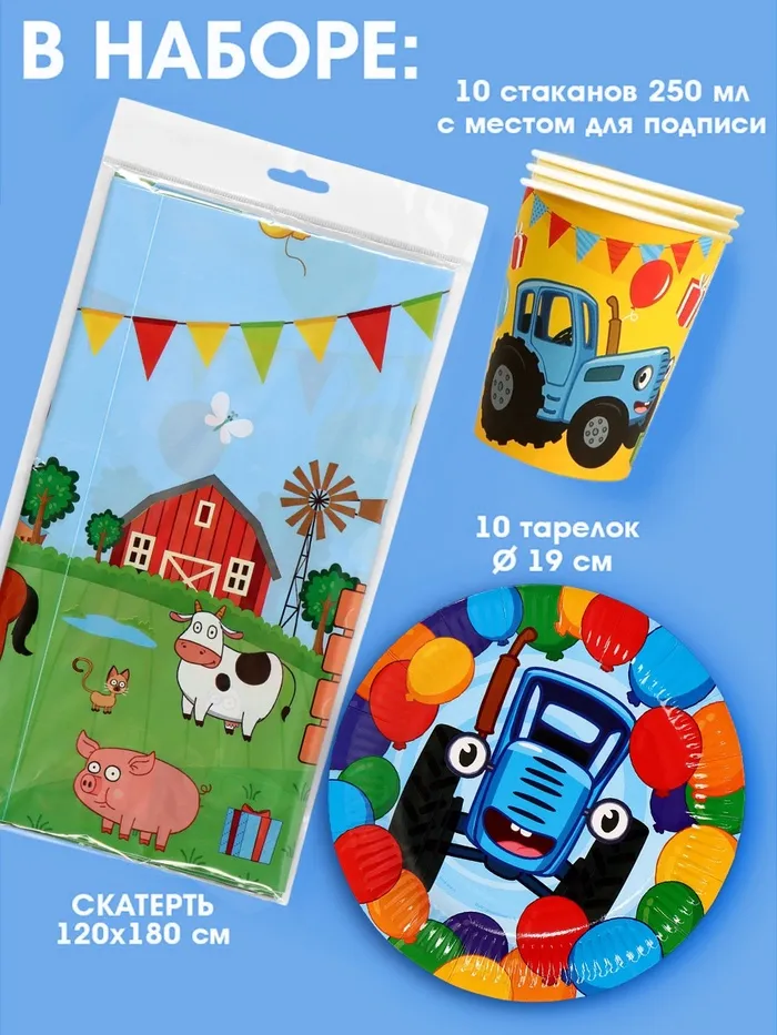 Набор одноразовой бумажной посуды на 10 персон — идеальное решение для тематического праздника! В комплекте: стаканы, тарелки и скатерть с ярким принтом «Синий трактор». Высокое качество, прочные материалы, стильный дизайн с любимым героем. Удобно использовать на дне рождения, вечеринке или утреннике. Быстро и красиво оформите стол — останется только праздновать! Пусть праздник будет по-настоящему масштабным!