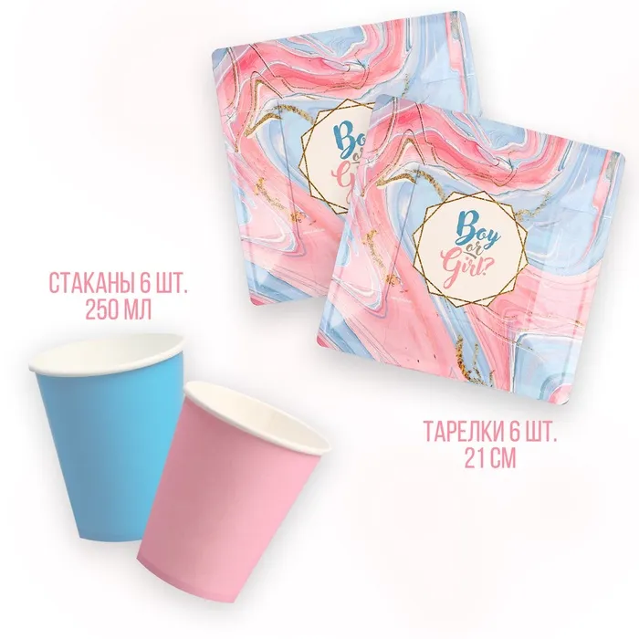 Посуда одноразовая бумажная на гендер-пати «Мальчик или девочка», стаканы 6 шт., тарелки 6 шт. — Характеристики