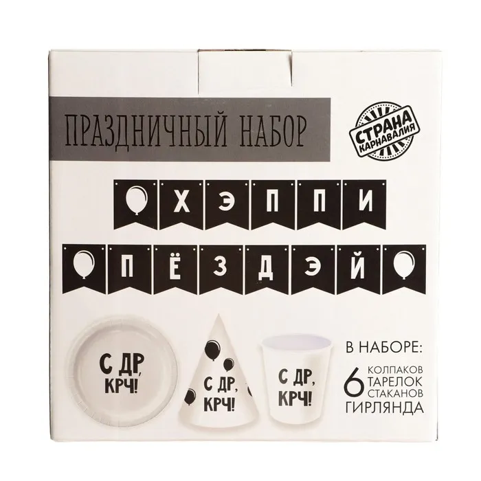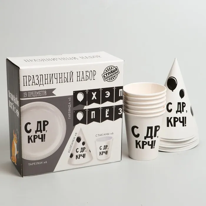 Посуда одноразовая бумажная «С ДР», 6 тарелок, 6 стаканов, 6 колпаков, 1 гирлянда — Характеристики