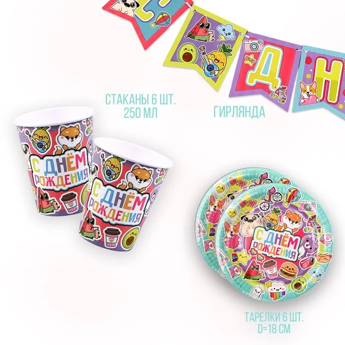 Посуда одноразовая бумажная для праздника Happy Birthday, 6 тарелок, 6 стаканов, 6 колпаков, гирлянда