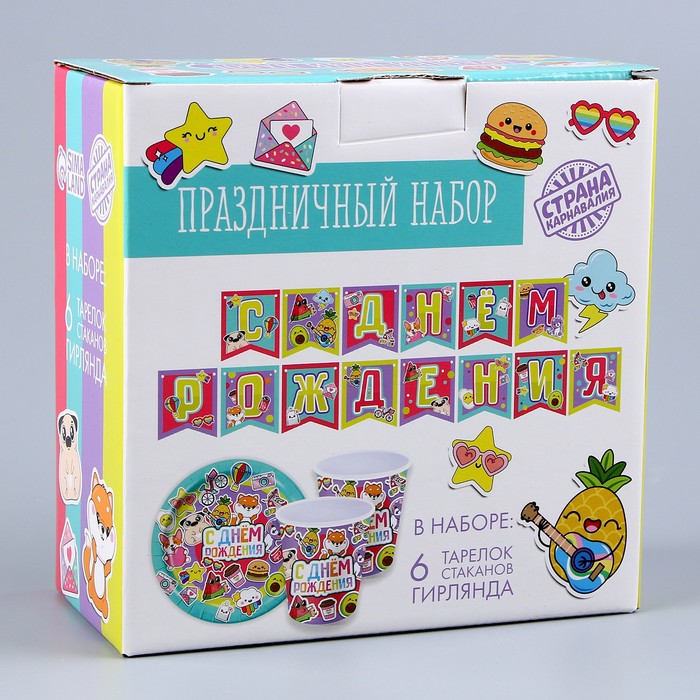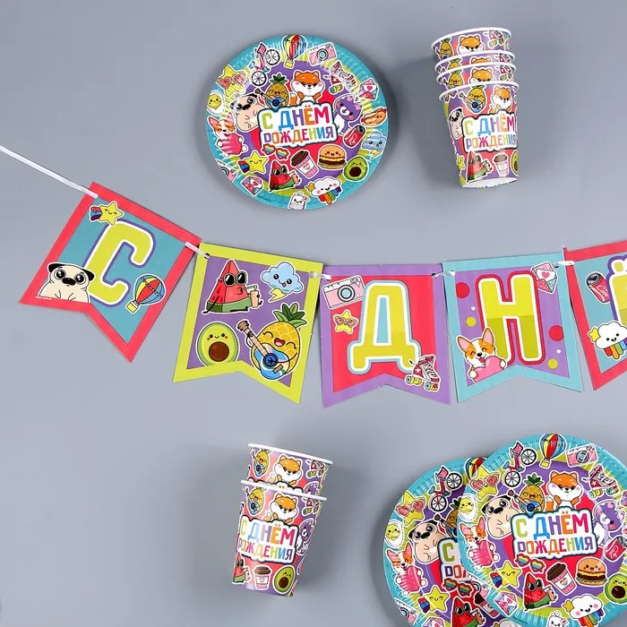 Посуда одноразовая бумажная «Стикеры», 6 тарелок, 6 стаканов, 1 гирлянда