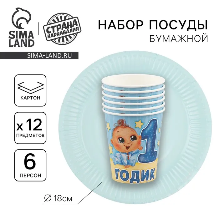 Посуда одноразовая бумажная для праздника «1 годик», 6 тарелок, 6 стаканов