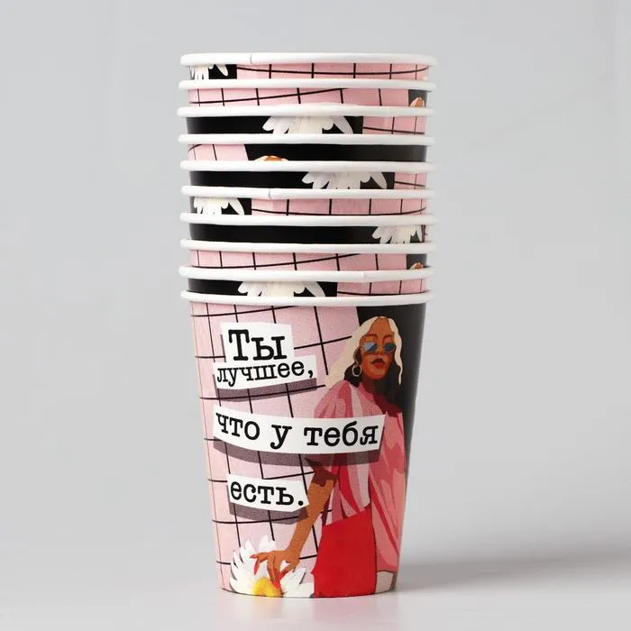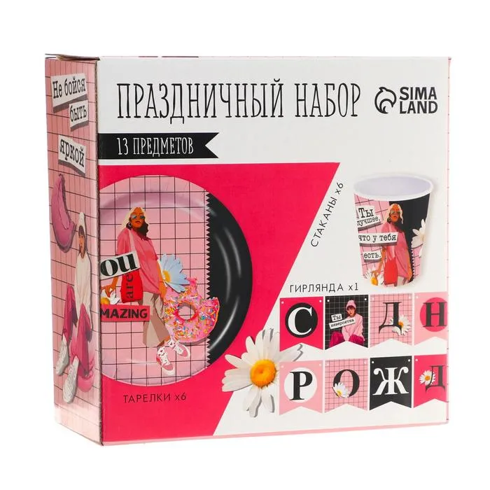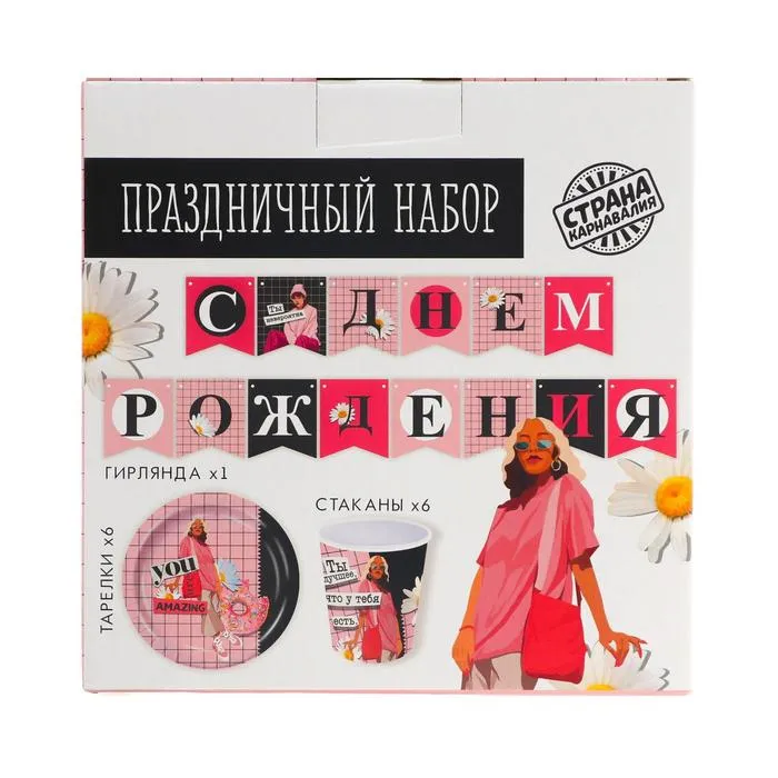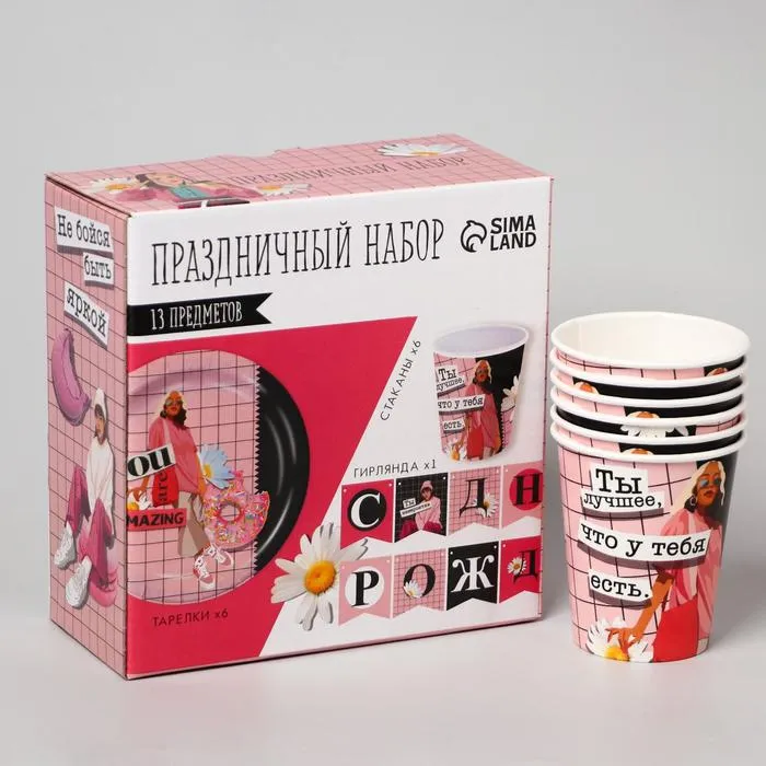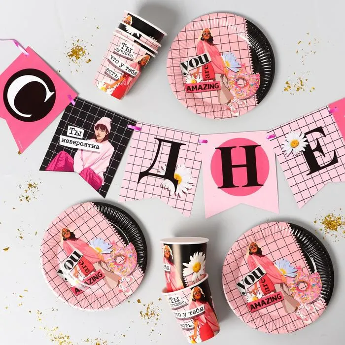 Посуда одноразовая бумажная «Ты лучшая», 6 тарелок, 6 стаканов, 1 гирлянда — Характеристики