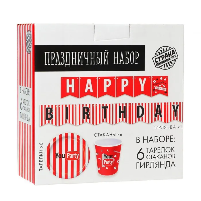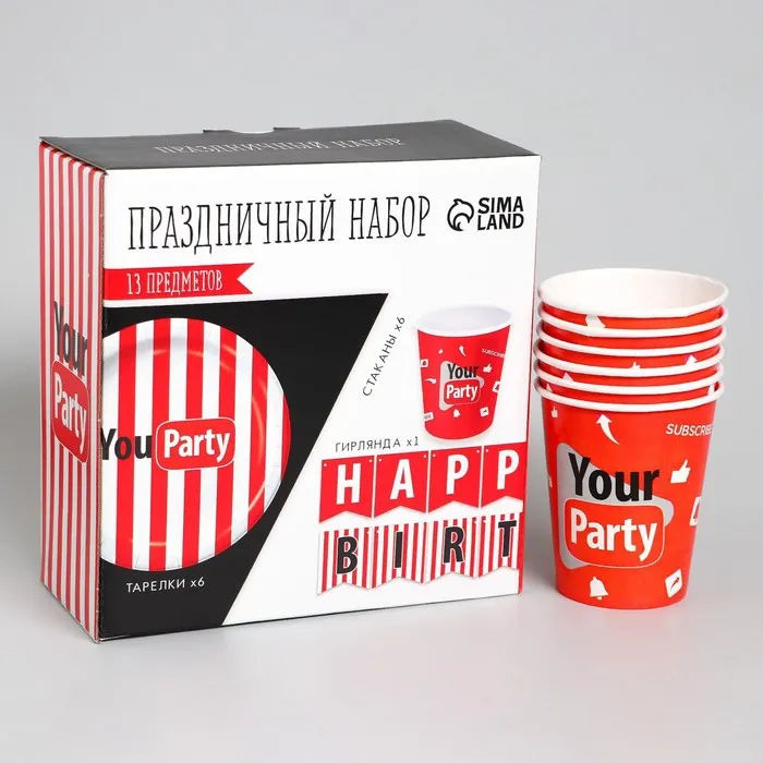 Посуда одноразовая бумажная Your party, 6 тарелок, 6 стаканов, 1 гирлянда