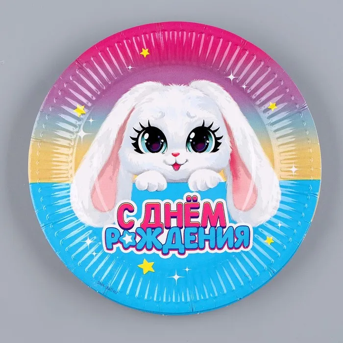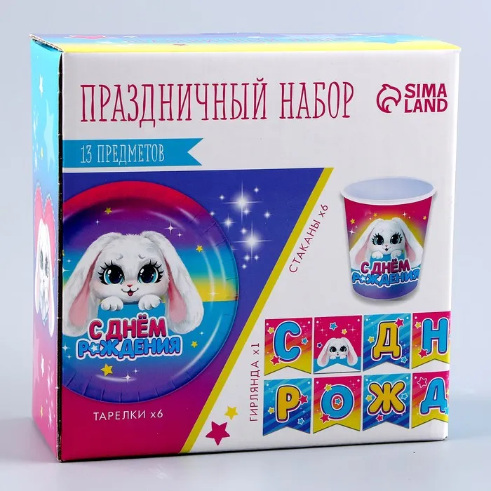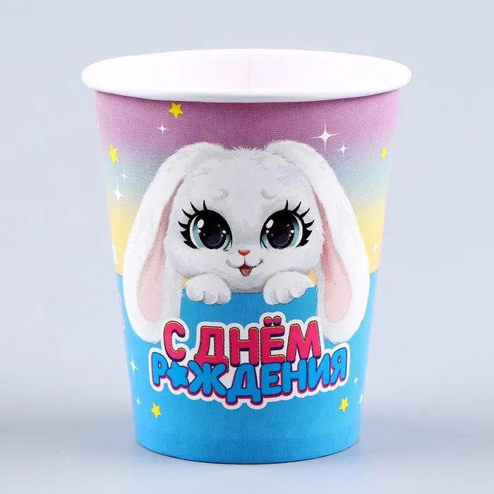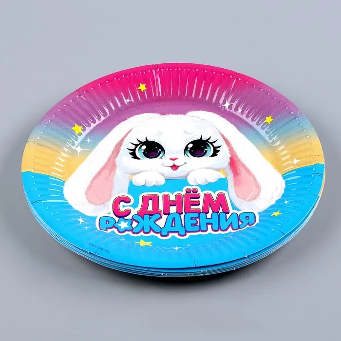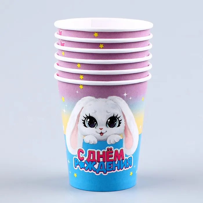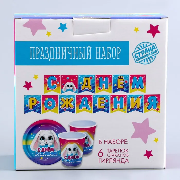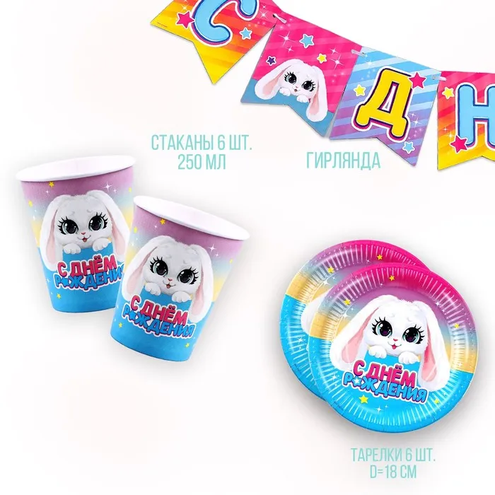 Посуда одноразовая бумажная «Зайка», 6 тарелок, 6 стаканов, 1 гирлянда — Характеристики