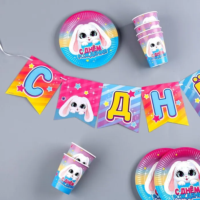 Посуда одноразовая бумажная «Зайка», 6 тарелок, 6 стаканов, 1 гирлянда