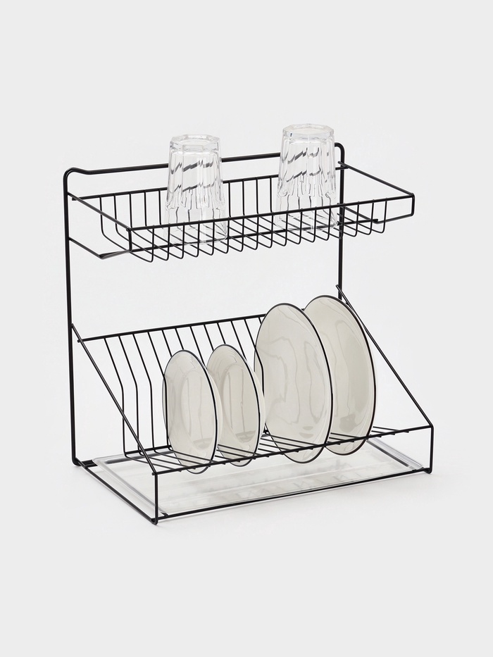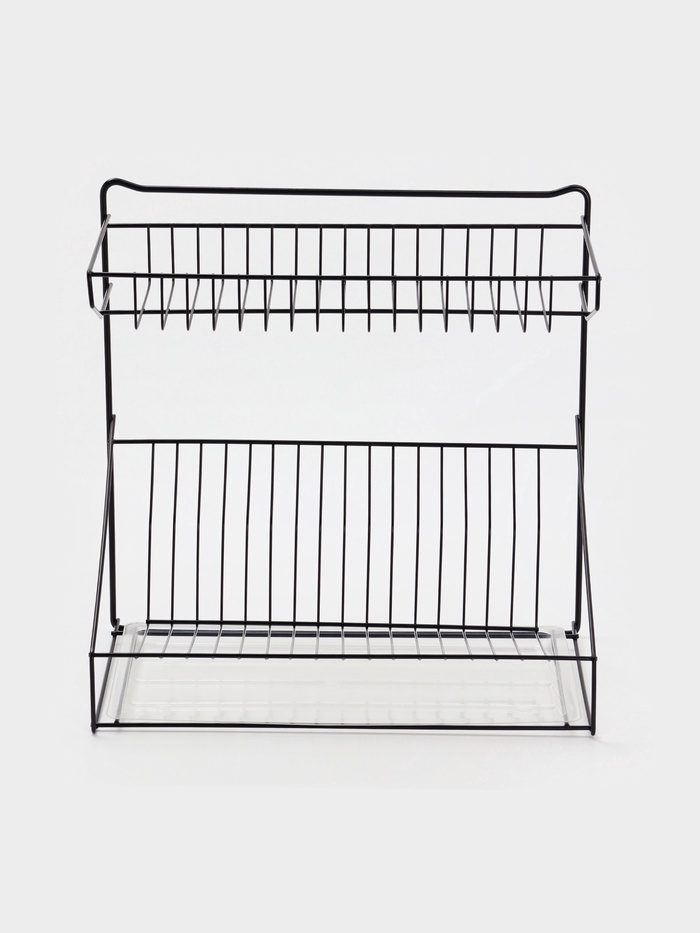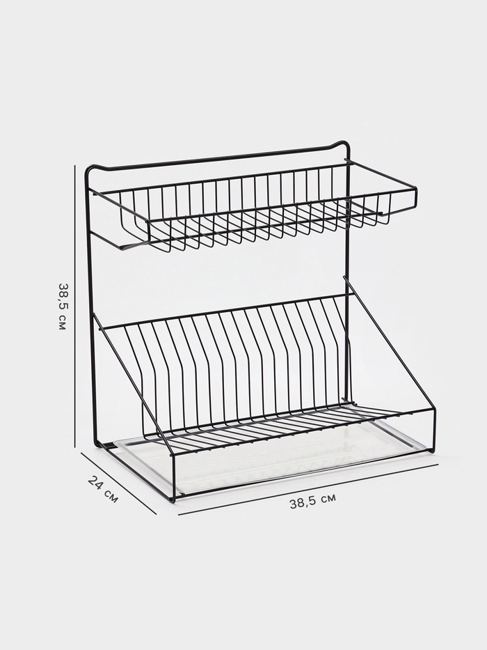 Чёрный двухъярусный посудосушитель — настольная система для быстрой и аккуратной сушки посуды. Размеры 38,5×24×38,5 см позволяют разместить тарелки, кружки, кастрюли и столовые приборы даже после приёма гостей. Металлическая конструкция с поддоном собирает лишнюю влагу, а чёрное покрытие гармонично вписывается в современный интерьер без визуального шума.
