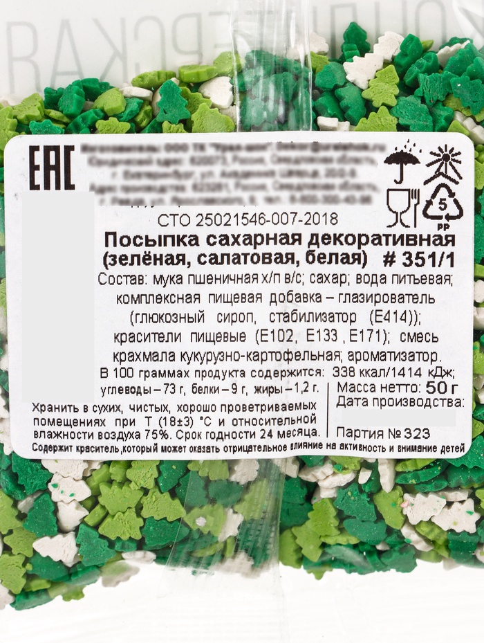 Посыпка кондитерская «Ёлочки», белые, зеленые, салатовые, новогодняя, 50 г — Характеристики