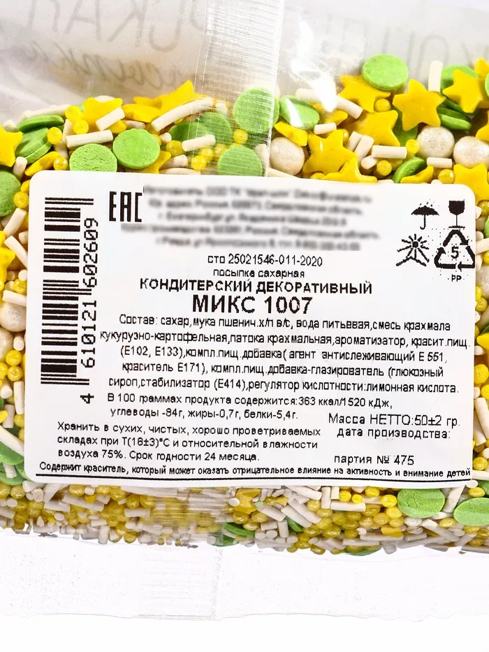 Посыпка кондитерская «Микс»: зеленый, желтый, белый, 50 г — Характеристики