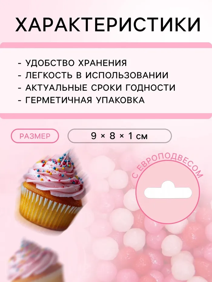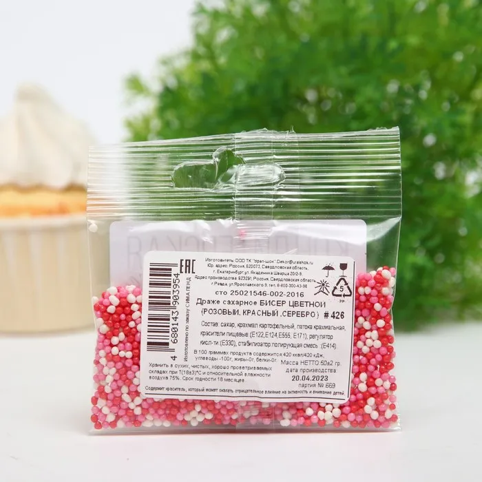 Посыпка кондитерская с мягким центром «Бисер»: розовая, красная, серебро, 20 г — Характеристики