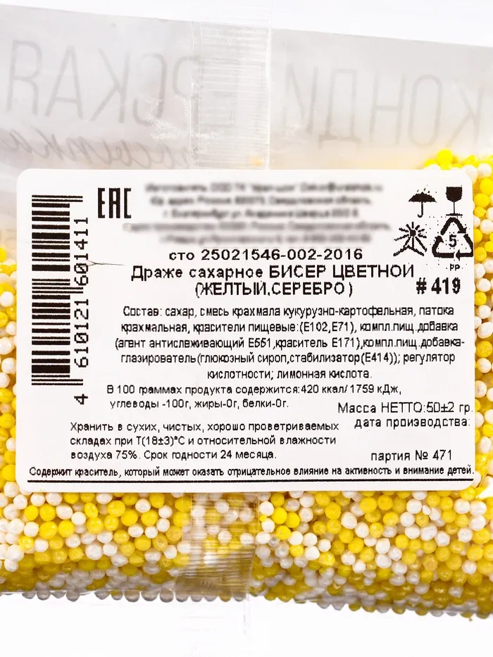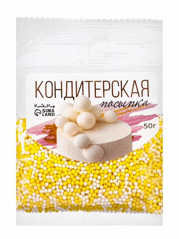Посыпка кондитерская с мягким центром «Бисер» цветной "желтый, серебро", 50 г — Характеристики