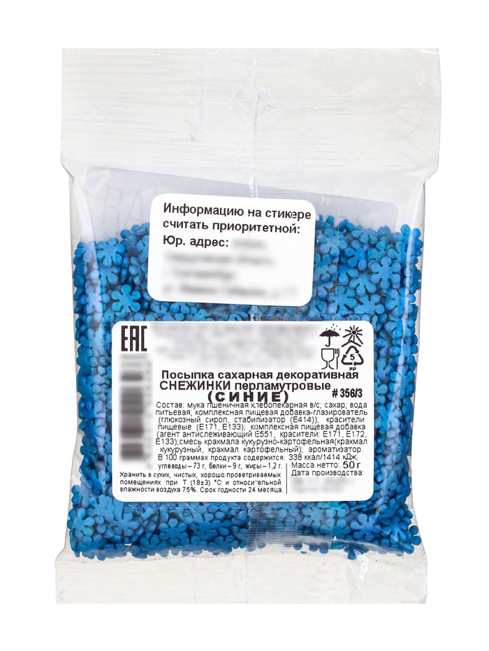 Посыпка кондитерская «снежинки перламутровые», синие, 50 г — Характеристики