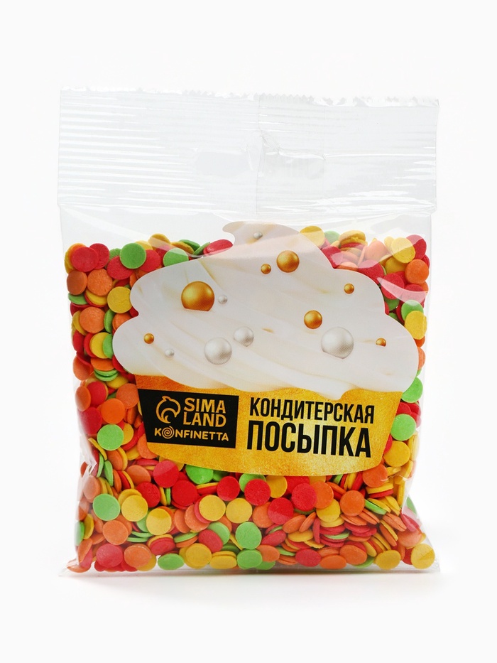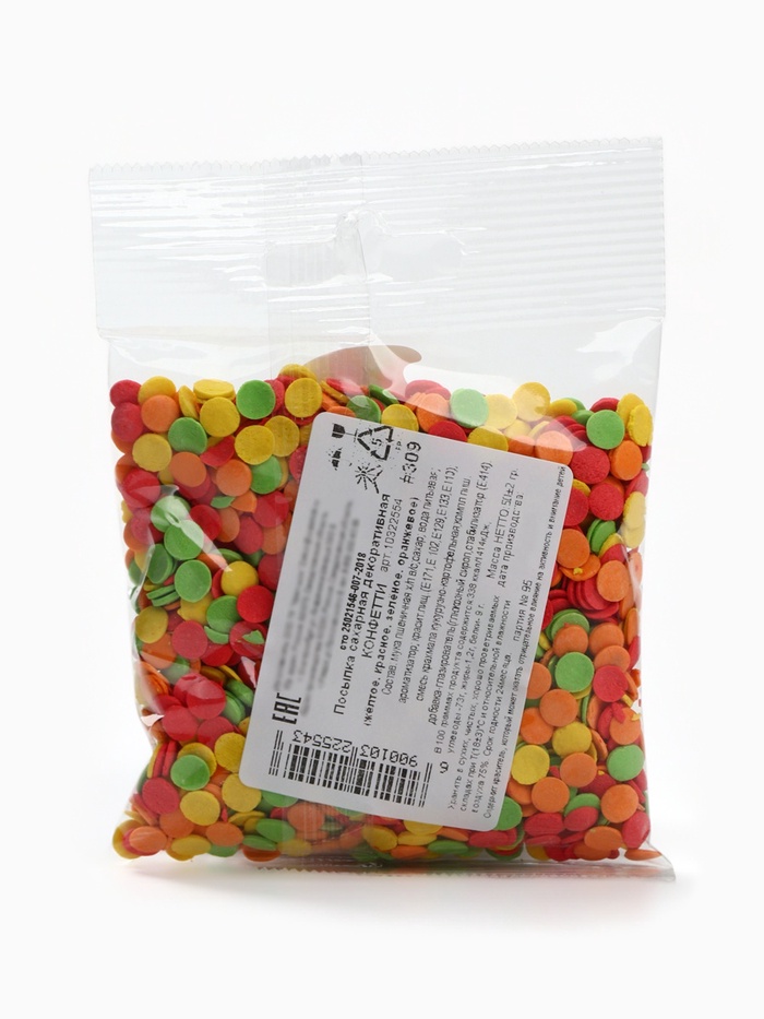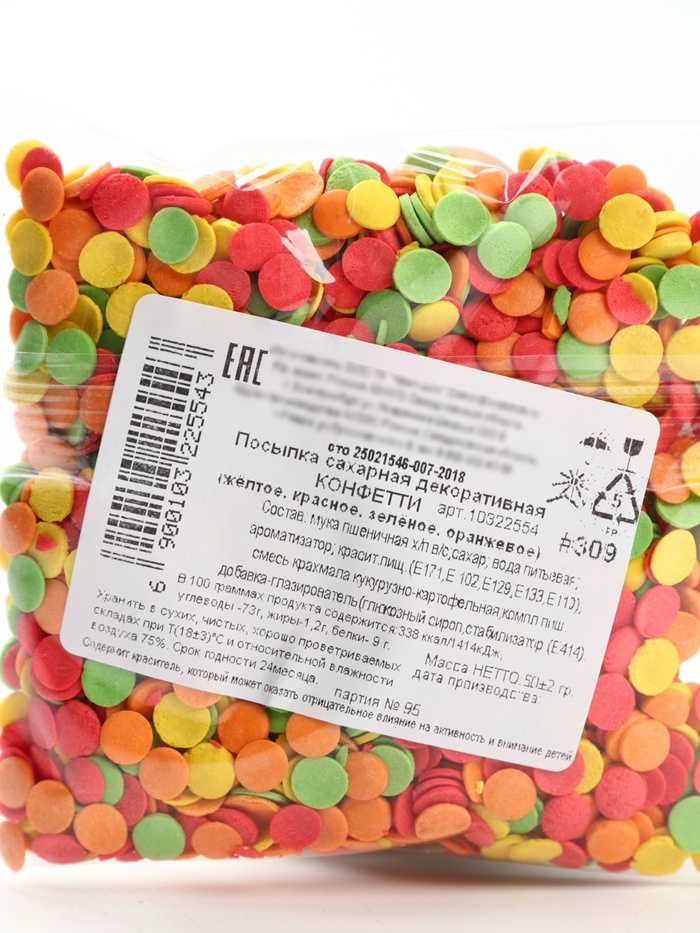 Состав: мука пшеничная х/л в/с; вода питьевая; сахар; ароматизатор; красители пищевые: (Е171, Е102, Е129, Е133, Е110); смесь крахмала кукурузно-картофельная; стабилизатор: полируюущая смесь (Е414).