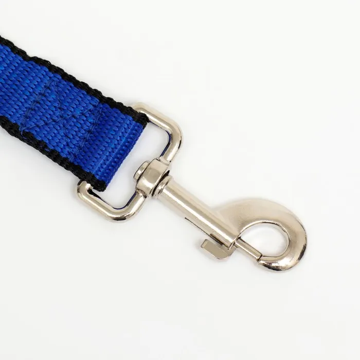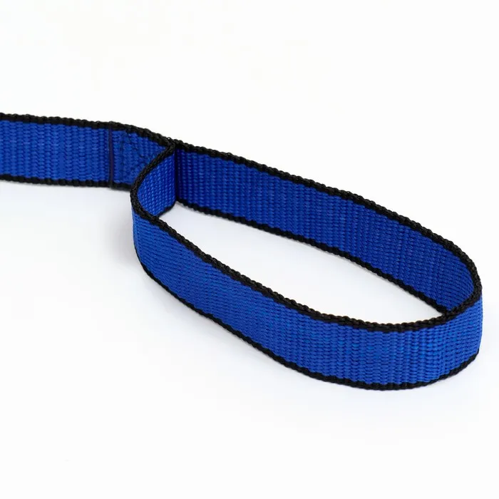Он имеет длину 2 м х 2,5 см, представлен в сине-чёрном цвете. Оснащен карабином на одном конце, чтобы легко присоединить его к ошейнику или наморднику животного.