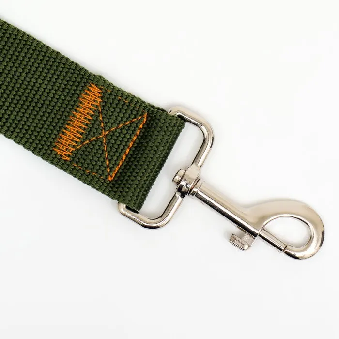 Он имеет длину 2 м х 4 см, представлен в зелёном цвете. Оснащен карабином на одном конце, чтобы легко присоединить его к ошейнику или наморднику животного.