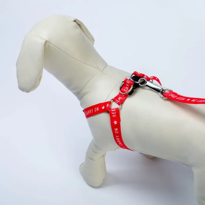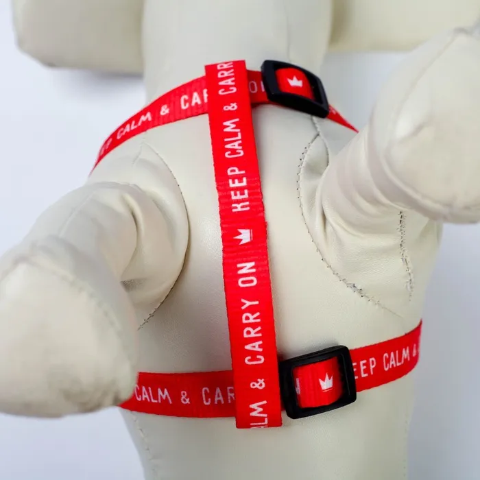 Текстильная шлейка регулируется. Поводок крепится к металлическому кольцу карабином. Шлейка исключает побег животного, если правильно подобрать размер и отрегулировать ремни.