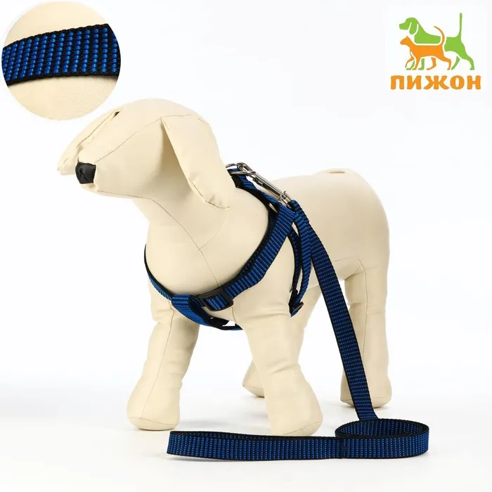 Обхват шлейки 36–49 см, ширина 1,5 см; однослойный поводок 120 см, ширина 1 см.