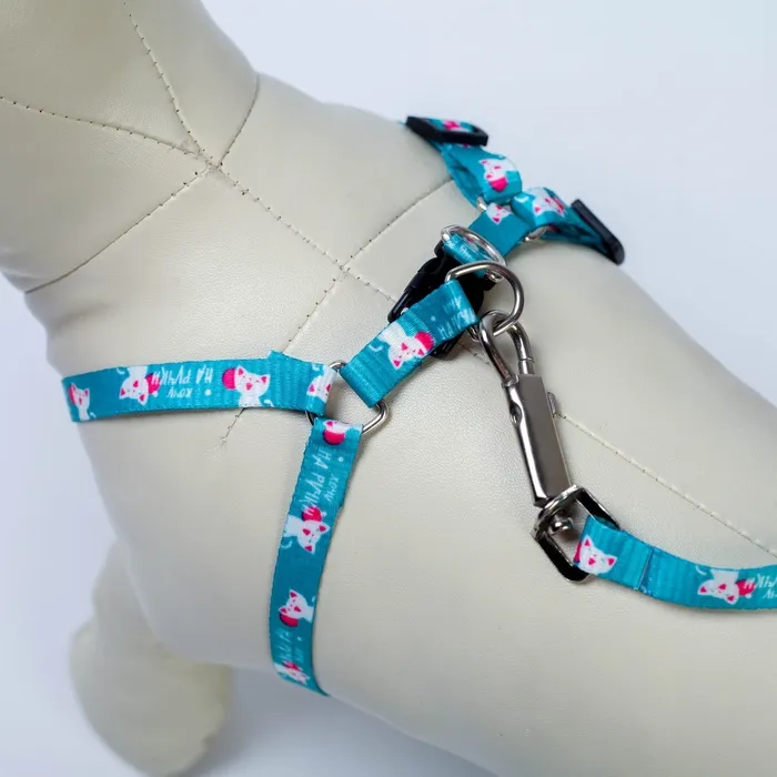 В стильный прогулочный комплект для собак входит лёгкая шлейка, прочный поводок и крепкий карабин. Ремни шлейки не давят на грудь и шею, равномерно распределяют нагрузку. Подходит для кошек весом до 15 кг. Текстильная шлейка регулируется. Поводок крепится к металлическому кольцу карабином.