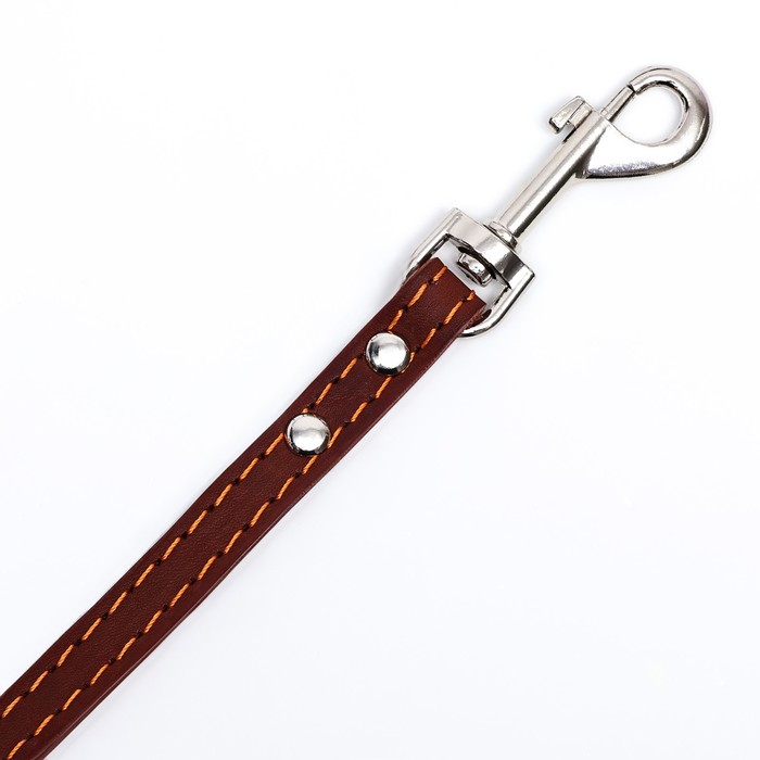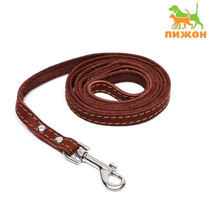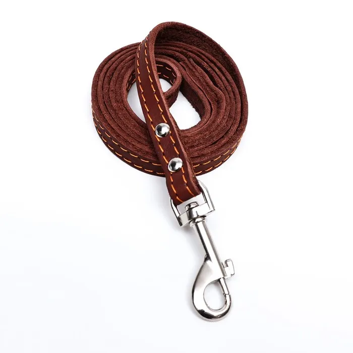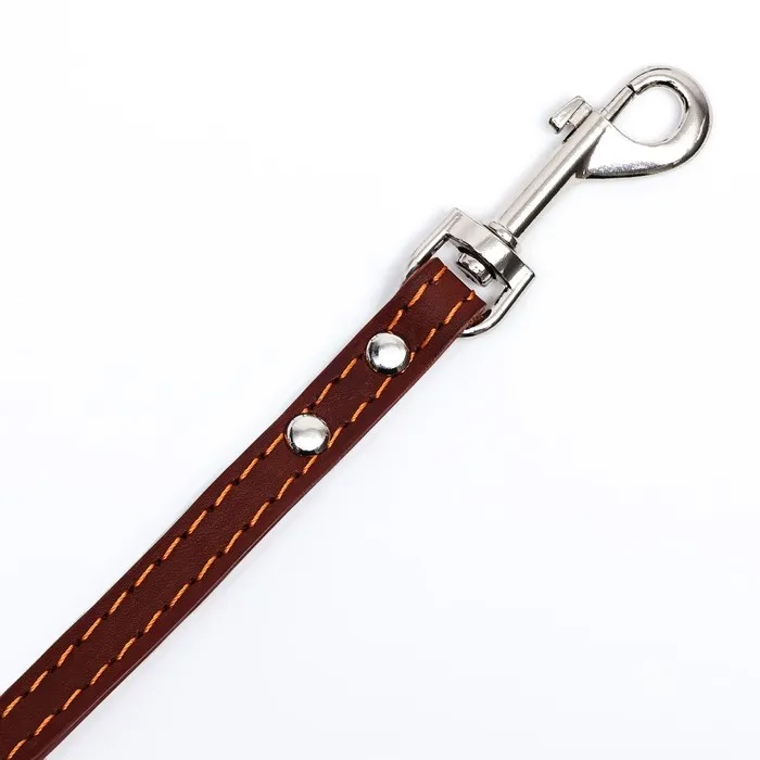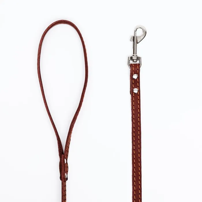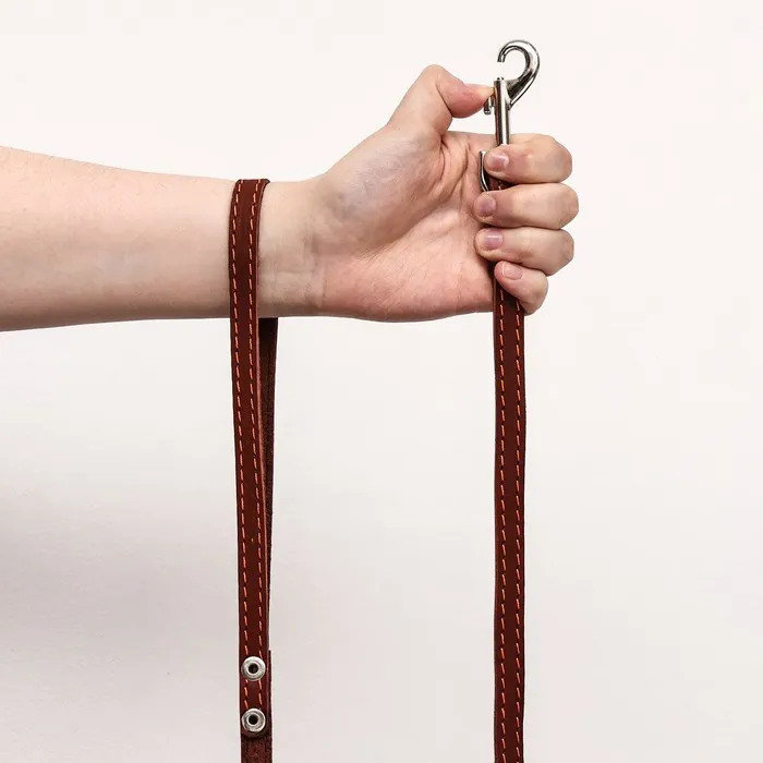 Поводок изготовлен из полосы кожи, прочный и эластичный. Для захвата предусмотрена удобная петля. Чтобы пристегнуть поводок к ошейнику, предусмотрен надежный карабин.