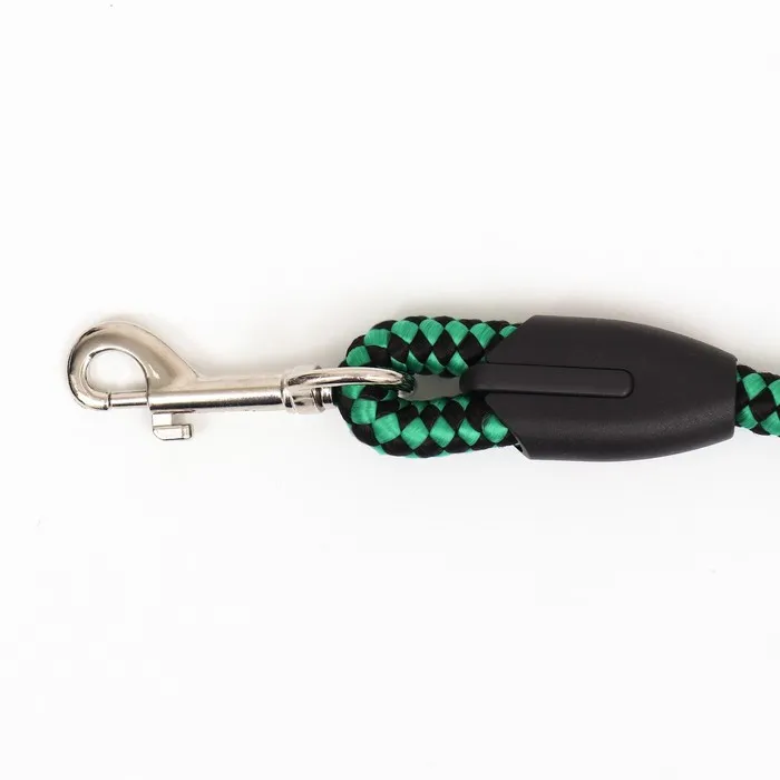 Круглая форма поводка позволяет удобно держать его в руке, а металлический карабин обеспечивает надежное крепление к ошейнику собаки.