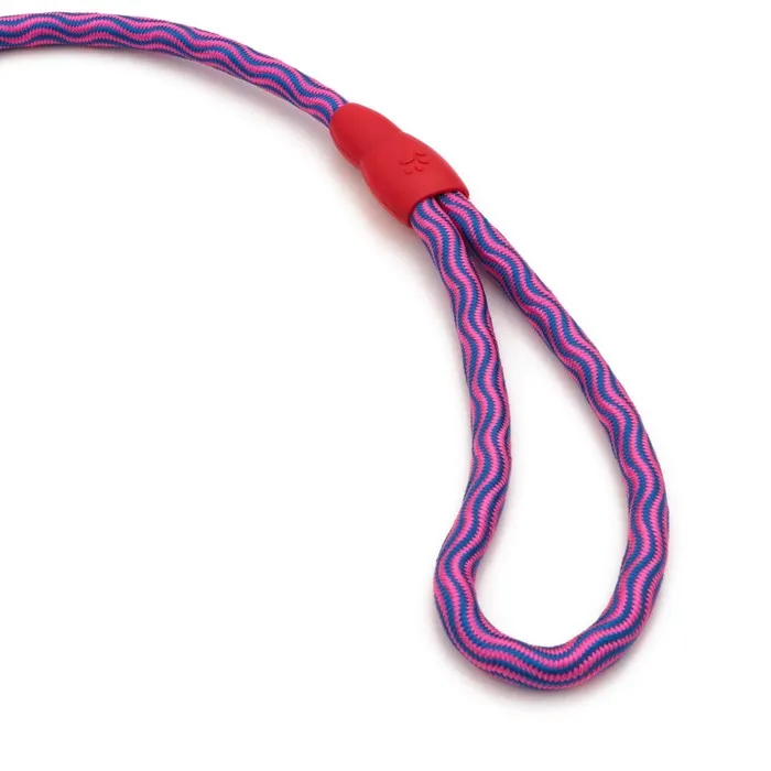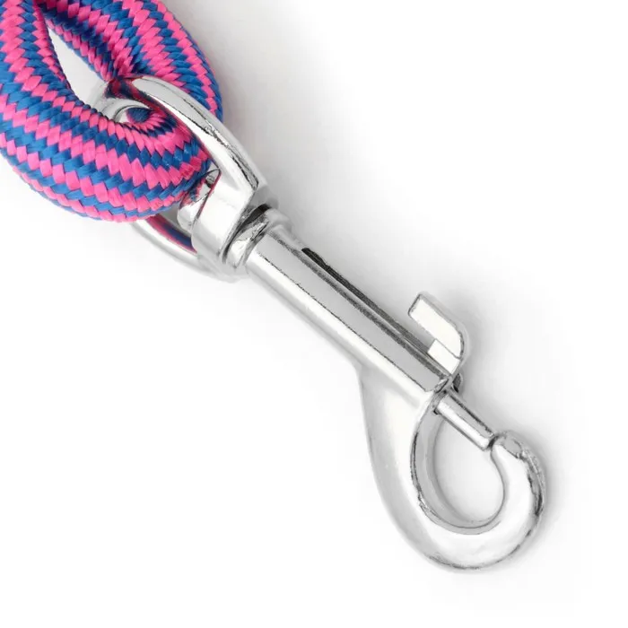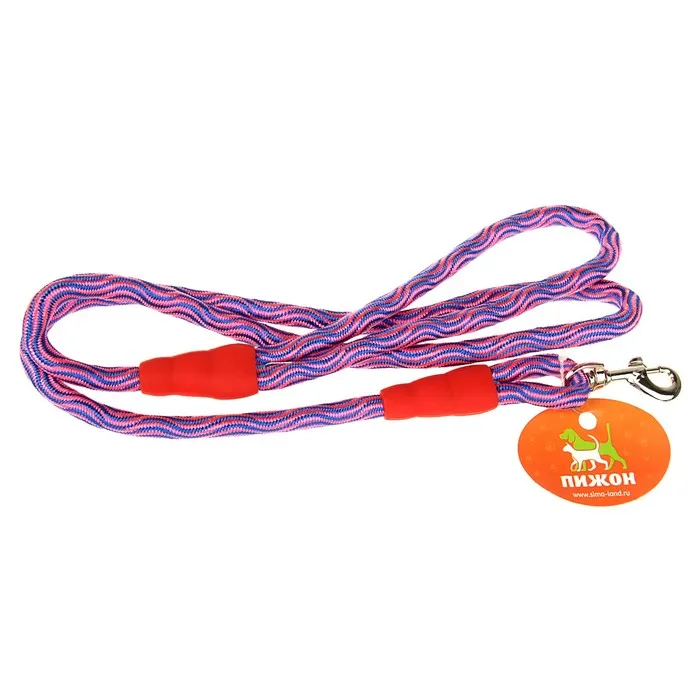 Круглая форма поводка позволяет удобно держать его в руке, а металлический карабин обеспечивает надежное крепление к ошейнику собаки.