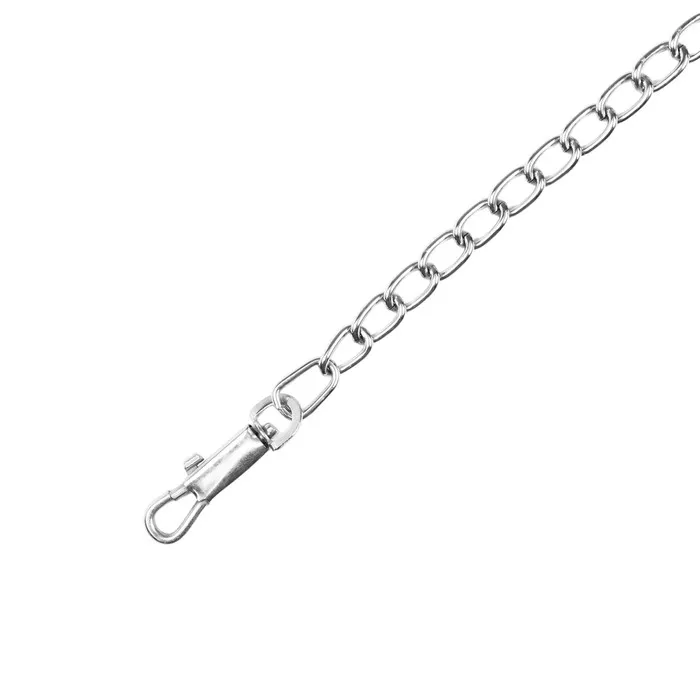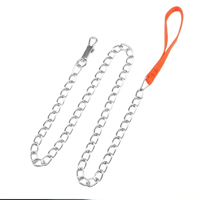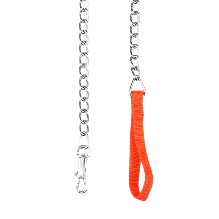 Поводок должен быть прочным и надежным. Металлический поводок полностью соответствует этим требованиям, плюс ко всему это красивый и износостойкий аксессуар. Поводок состоит из хромированной цепочки и мягкой нейлоновой ручки. Ручка прошита армированной нитью, удобно располагается в ладони и не натирает при натяжении. Поводок оснащен стальным карабином.