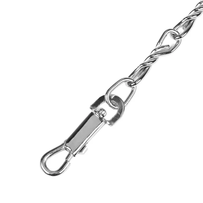 Поводок должен быть прочным и надежным. Металлический поводок полностью соответствует этим требованиям, плюс ко всему это красивый и износостойкий аксессуар. Поводок состоит из хромированной цепочки и мягкой нейлоновой ручки. Ручка прошита армированной нитью, удобно располагается в ладони и не натирает при натяжении. Поводок оснащен стальным карабином.
