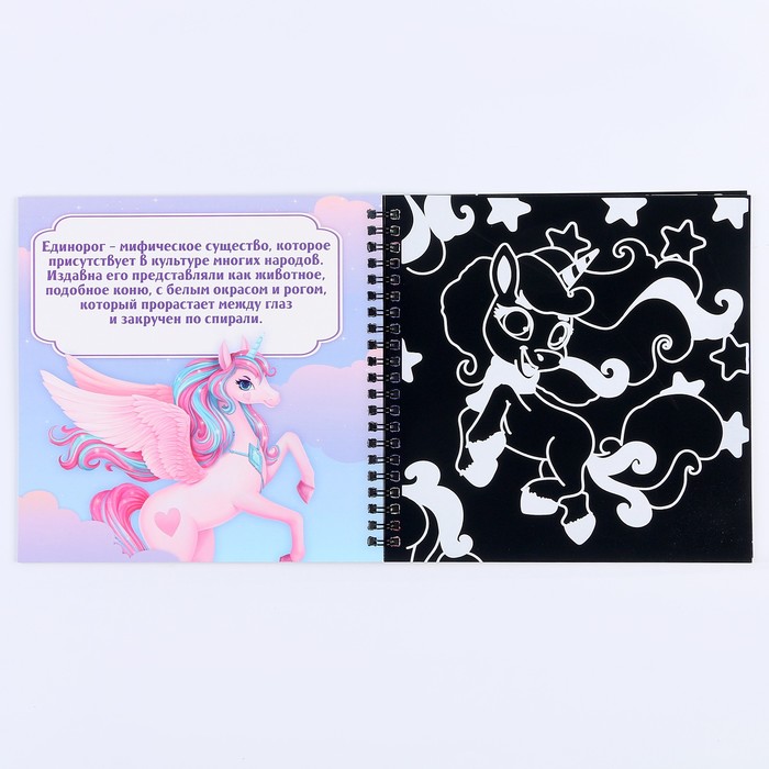 - 10 листов, покрытых чёрным слоем, на который нанесён контур рисунка. Процарапайте его с помощью штихеля, и сквозь контуры проступит сияющий разноцветный слой.