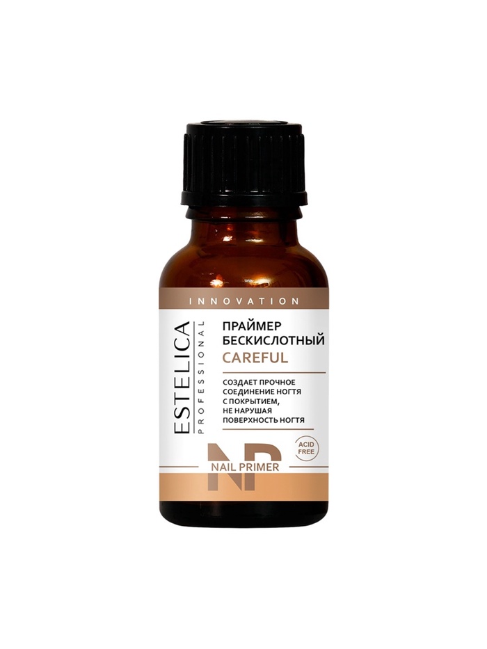 ESTELICA PROFESSIONAL CAREFUL, бескислотный праймер 15 мл — профессиональное средство для усиления адгезии и надёжного соединения ногтевой пластины с искусственными материалами, такими как гель-лак, гель или акрил. Праймер создаёт тонкую защитную пленку на поверхности ногтя, которая обеспечивает прочное сцепление и предотвращает образование сколов и отслоений.