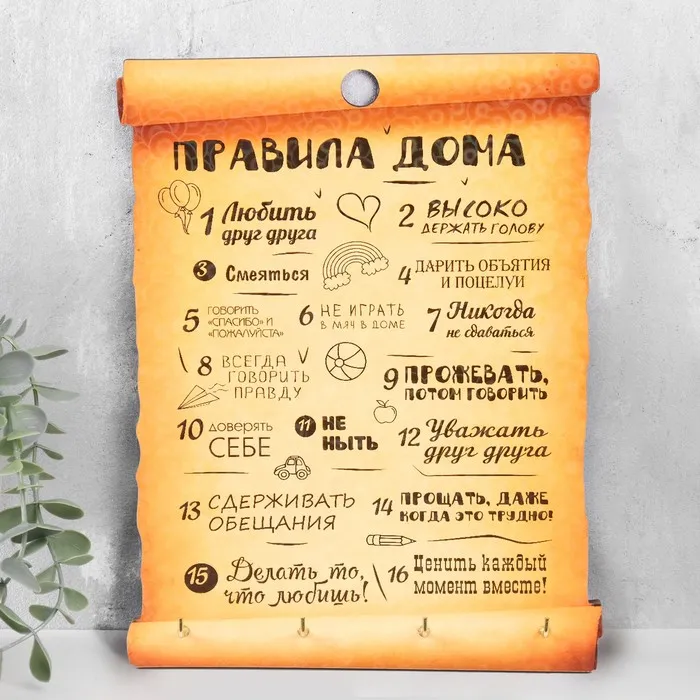 Оригинальный постер с правилами для дома украсит интерьер, поднимет настроение и напомнит о важных бытовых мелочах. Изделие изготовлено из дерева, поэтому его удобно крепить к стене или любой другой поверхности, оно не изменит форму и не требует особого ухода.