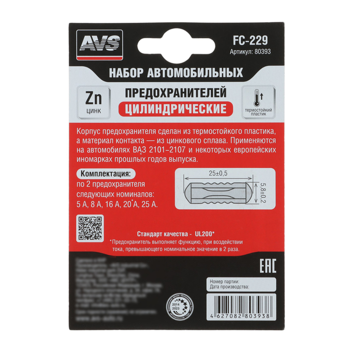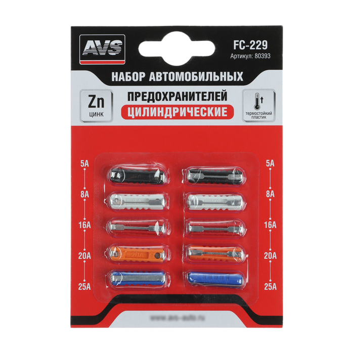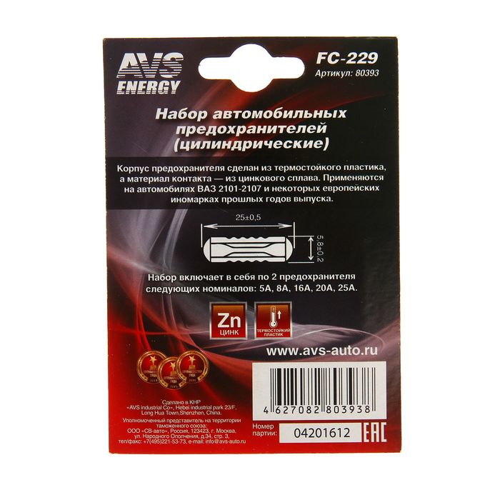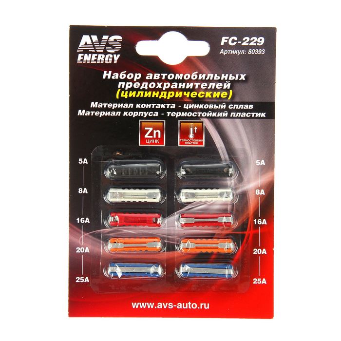 Предохранители цилиндрические AVS FC-229 (плавкие вставки) предназначены для защиты силовых, сигнальных и управляющих цепей от перегрузок и коротких замыканий. Применяются на автомобилях ВАЗ 2101-2107 и некоторых европейских иномарках прошлых лет выпуска.