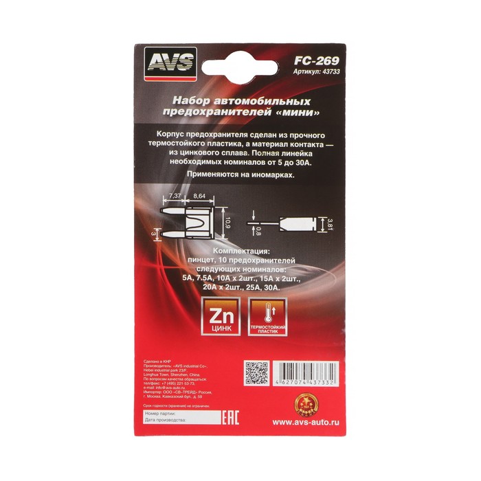 Предохранители AVS FC-269, «мини», 5-30 А, набор 10 шт. — Характеристики