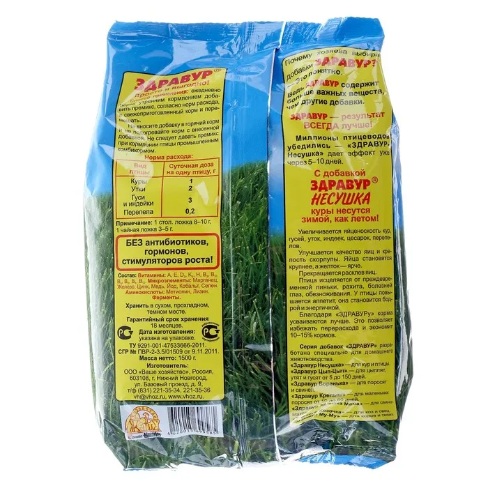 Добавка «Здравур Несушка» укрепляет здоровье кур, защищает от заболеваний: авитаминоза, обезноживания, каннибализма. У кур улучшается аппетит, состояние перьевого покрова, они становятся бодрыми и веселыми. Элементы, содержащиеся в «Здравур Несушке», активизируют обменные процессы в организме кур, именно поэтому уже через 7–10 дней Вы увидите реальный результат — яйценоскость кур повысится, скорлупа станет прочнее. Кроме того, «Здравур Несушка» помогает сэкономить корма! Специальные кормовые ферменты, содержащиеся в ней, повышают усвоение организмом питательных веществ из корма. Благодаря этому ни один грамм кормов не тратится зря! «Здравур Несушка» очень выгодна в применении: курице в день требуется всего 1 г добавки, а прибавка яиц составит до 5–6 штук в неделю. Добавка «Здравур Несушка» не содержит антибиотиков, ГМО, химических стимуляторов роста, поэтому яйца остаются такими же «чистыми», вкусными и полезными, как при кормлении только обычными кормами.