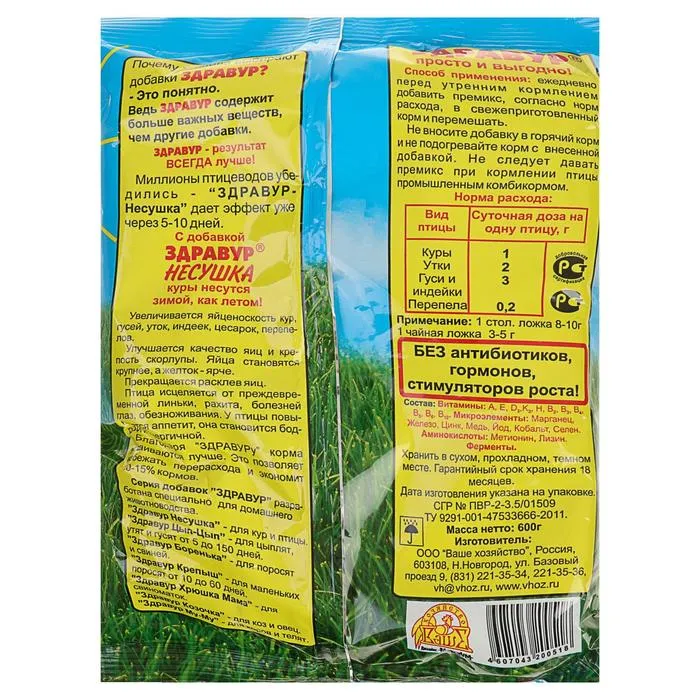 Кроме того, «Здравур Несушка» помогает сэкономить корма! Специальные кормовые ферменты, содержащиеся в ней, повышают усвоение организмом питательных веществ из корма. Благодаря этому ни один грамм кормов не тратится зря! «Здравур Несушка» очень выгодна в применении: курице в день требуется всего 1 г добавки, а прибавка яиц составит до 5–6 штук в неделю.