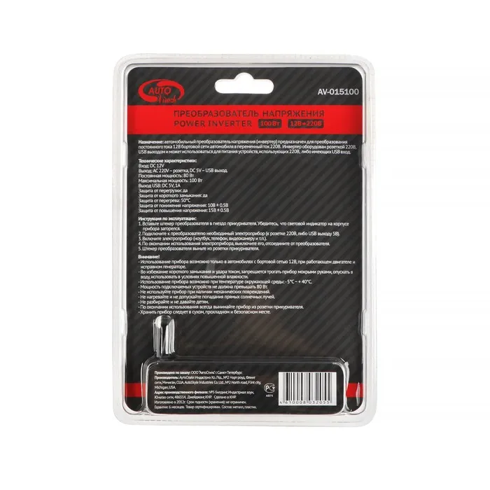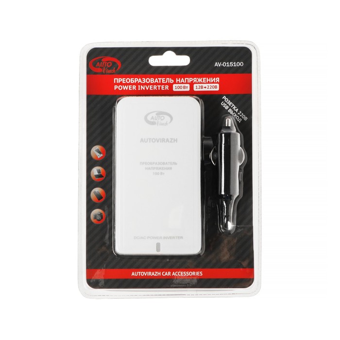 Преобразователь напряжения-инвертер с USB-портом 80-100 Вт, сила тока 1 А AUTOVIRAZH AV-015100 можно использовать для подключения маломощных электроприборов или увеличить мощность зарядки. Модель повышает качество передачи энергии без падения мощности двигателя.