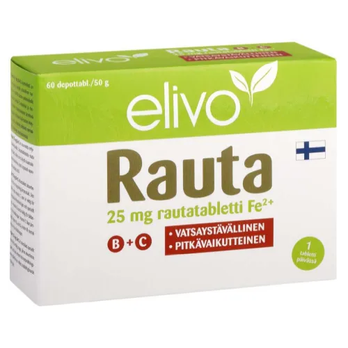 Elivo Rauta - богат витамином С, который способствует усвоению железа, и витаминами группы В для образования красных кровяных телец. Железо, входящее в состав препарата, представляет собой феррофумарат Fe2+, который не раздражает желудок.