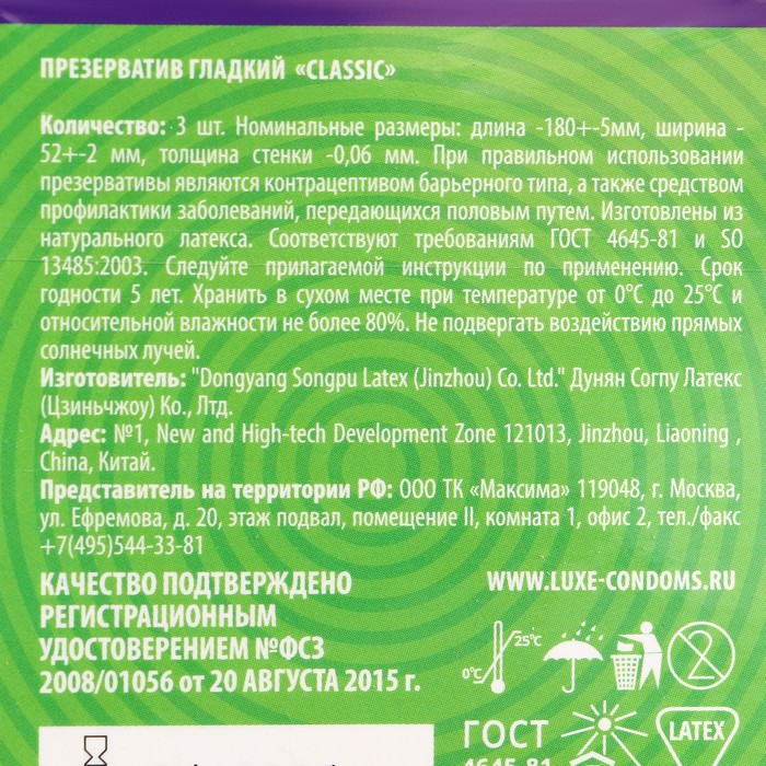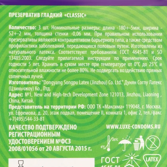 Описание: презервативы LUXE ROYAL Classic гладкие, 3 шт. При правильном использовании презервативы помогают предотвратить беременность и уменьшают риск передачи СПИД и заболеваний, передающихся половым путем. Однако не один метод контрацепции не дает 100% защиты. Только для одноразового использования. Перед применением ознакомьтесь с инструкцией внутри упаковки. Хранить при температуре от 0 до 25°С вдали от прямых солнечных лучей.