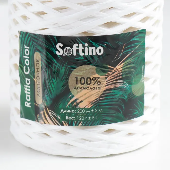 Пряжа для вязания спицами, крючком 100% целлюлоза Softino Raffia Color, ленточная, белая, 200 м ±2 м, 120 г — Характеристики