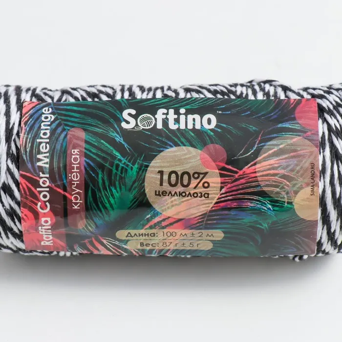 Пряжа для вязания спицами, крючком 100% целлюлоза Softino Raffia Color Melange, кручёная, чёрная, 100 м ±2 м, 87 г — Характеристики