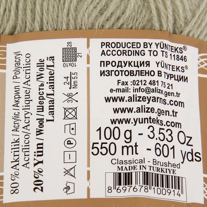 Пряжа для вязания спицами, крючком ALIZE, Angora Gold, 20% шерсть, 80% акрил, 550 м/100 г, (267 пастельный зелёный) — Характеристики