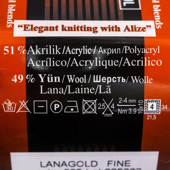 Пряжа для вязания спицами, крючком ALIZE, Lanagold fine, 49% шерсть, 51% акрил, 390 м/100 г, (505) — Характеристики