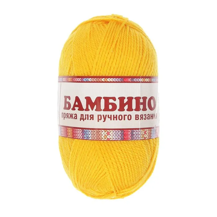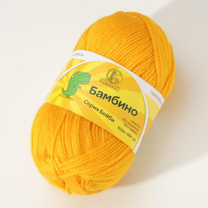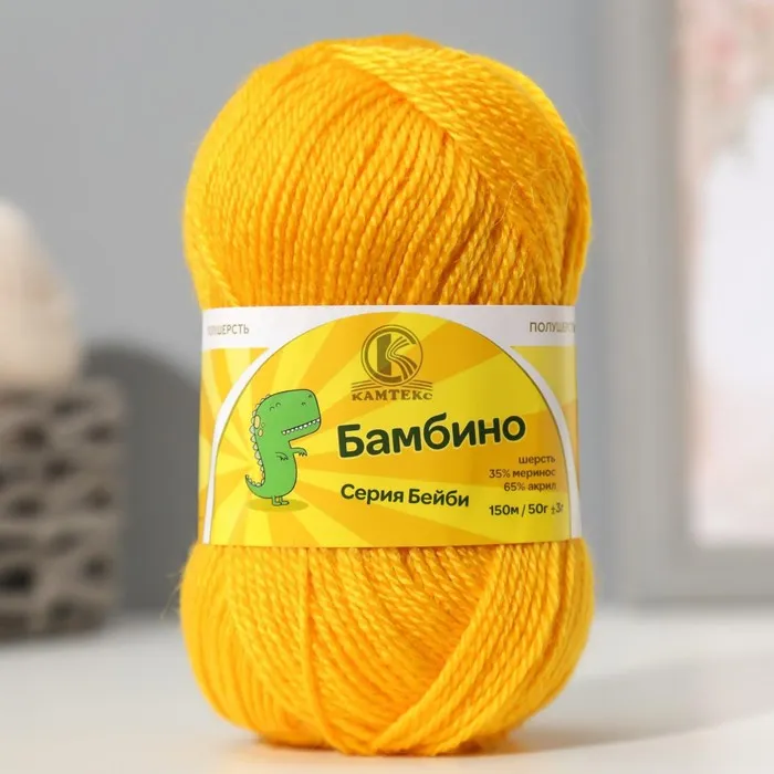 Пряжа для вязания спицами, крючком «Камтекс. Бамбино», 35% шерсть меринос, 65% акрил, 150 м/50 г, (104 жёлтый), в составе которой присутствует акрил и элитная мериносовая шерсть, отличающаяся особым тонким, длинным и мягким волокном. Среди рукодельниц этот вид пряжи особо любим, ведь из неё легко, быстро и аккуратно вяжутся все изделия. Именно эту пряжу выбирают для создания детских вещей, и даже грудничкам вяжут различные пинетки, костюмчики, шапочки. Ниточка гладкая и шелковистая, ровно ложится в узор или рисунок, она абсолютна гипоаллергенна и не раздражает нежную кожу малыша. А благодаря выгодному сочетанию состава в вещах из «Бамбино» уютно в любое время года. Зимой — тепло, а летом — не жарко. Кроме того, за счёт мериносовой шерсти исключается «парниковый эффект», так как она отлично впитывает влагу.