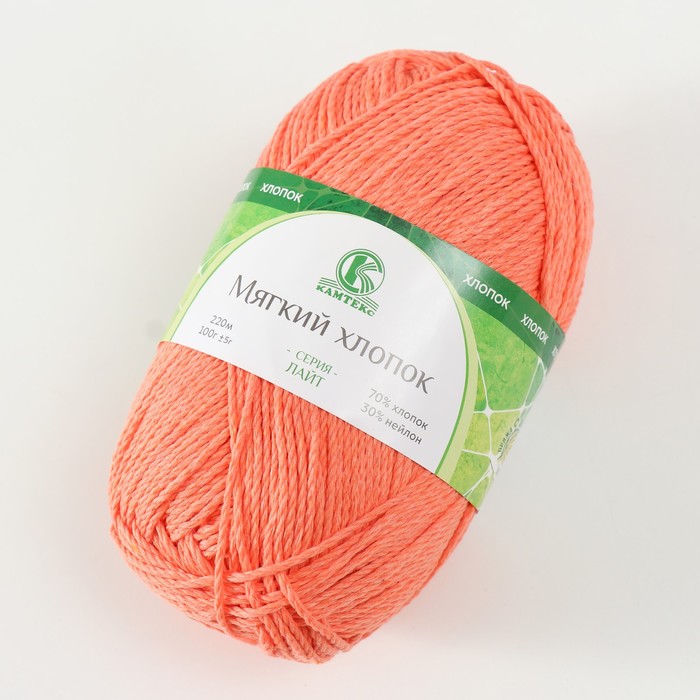 Пряжа для вязания спицами, крючком «Камтекс. Мягкий хлопок», 70% хлопок, 30% нейлон, 220 м/100 г, (036 абрикос) — Характеристики