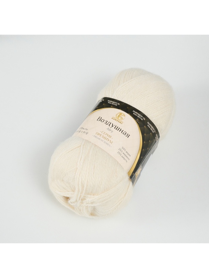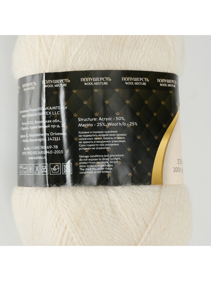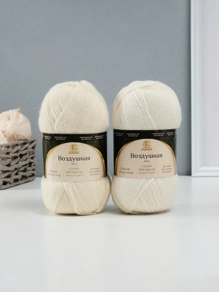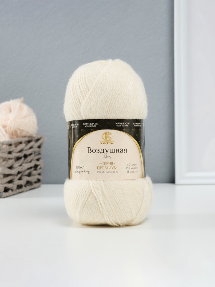 Пряжа для вязания спицами, крючком «Камтекс. Воздушная», 25% мериносовая шерсть, 25% шерсть, 50% акрил, 370м/100 г, (001 суровый) — Характеристики