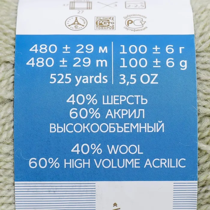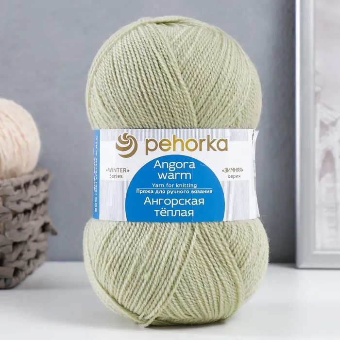 Пряжа для вязания спицами, крючком «Пехорский текстиль. Ангорская тёплая», 40% шерсть, 60% акрил, 480 м/100 г, (1076 св. фисташковый) — Характеристики