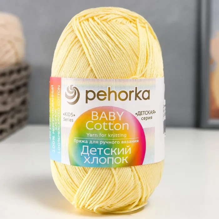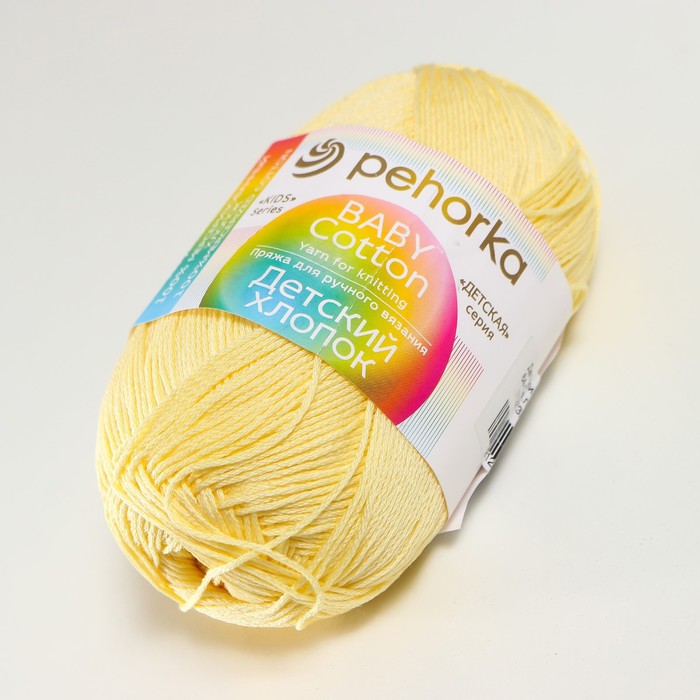 Пряжа для вязания спицами, крючком «Пехорский текстиль. Детский хлопок», 100% мерсеризованный хлопок, 330 м/100 г, (64 св. лимон) — Характеристики